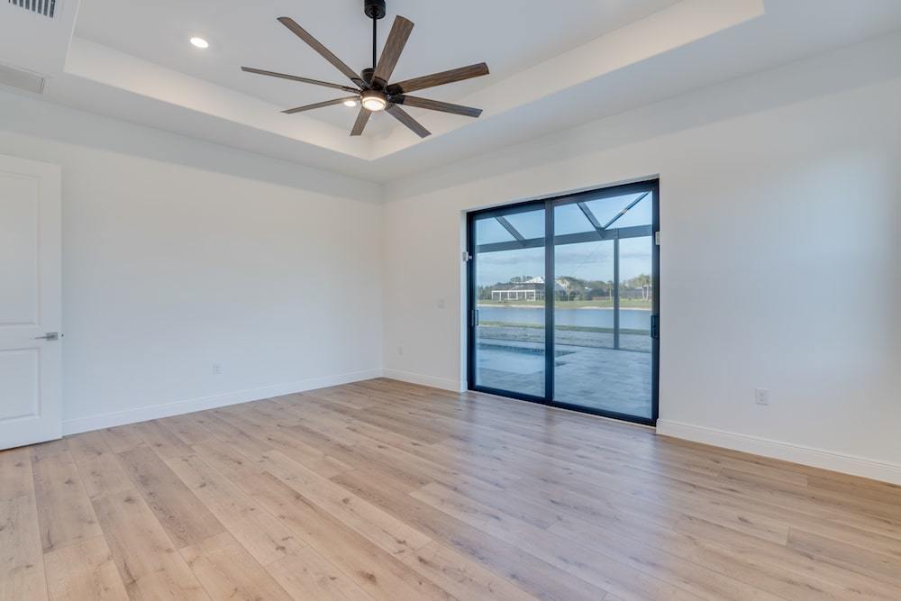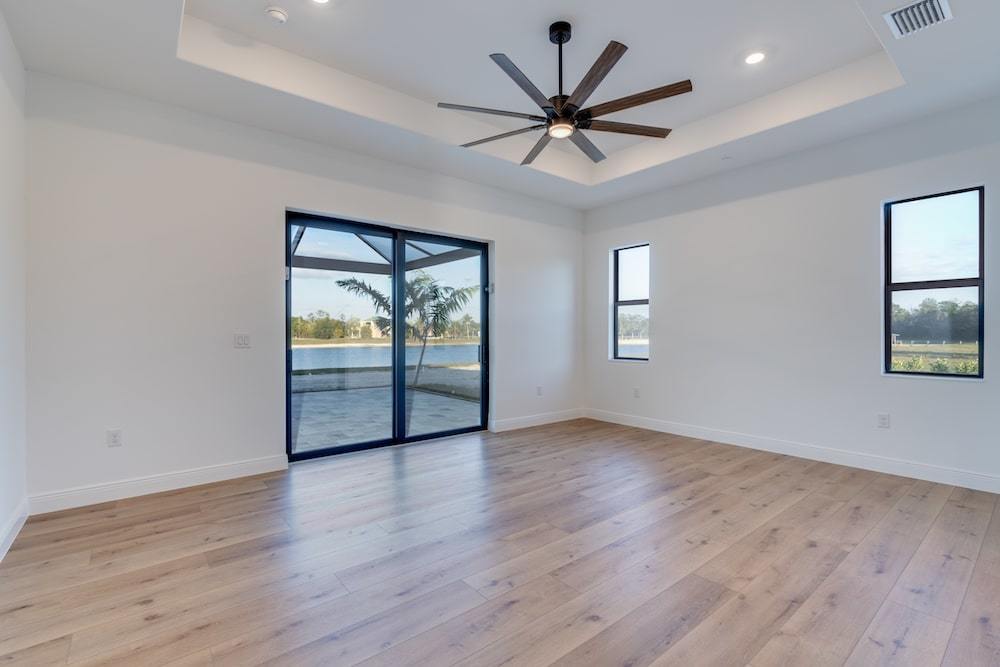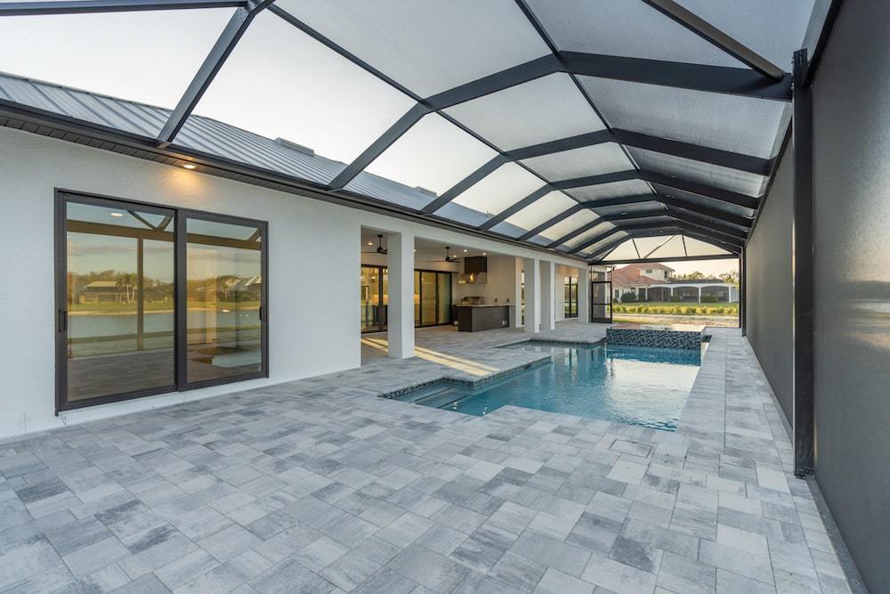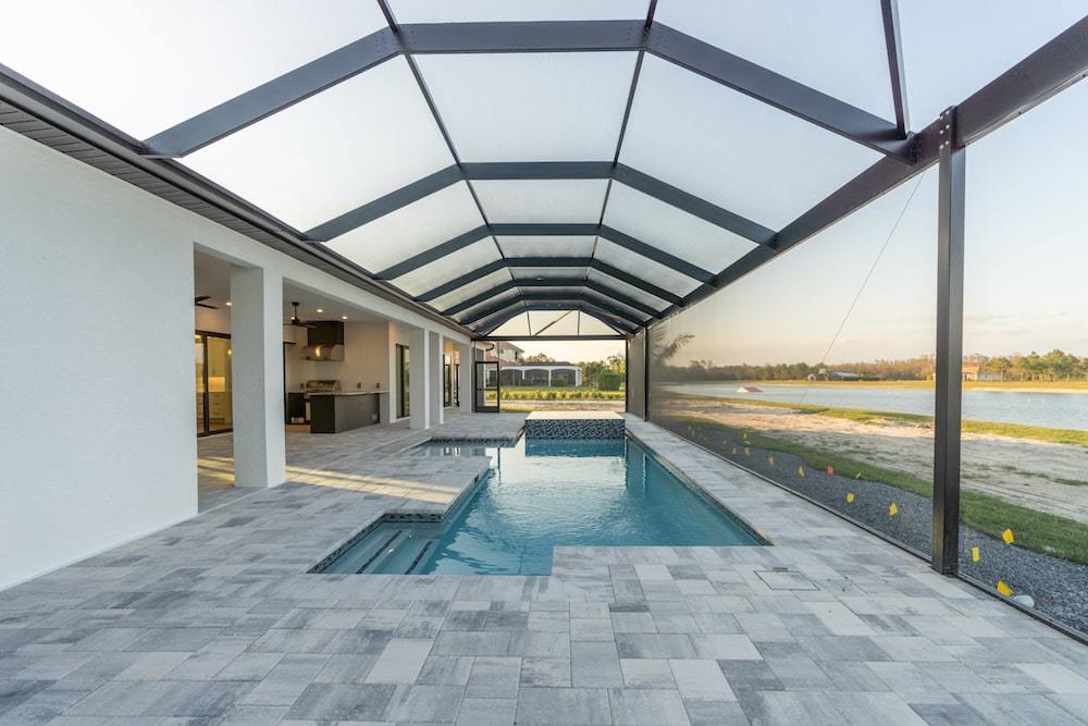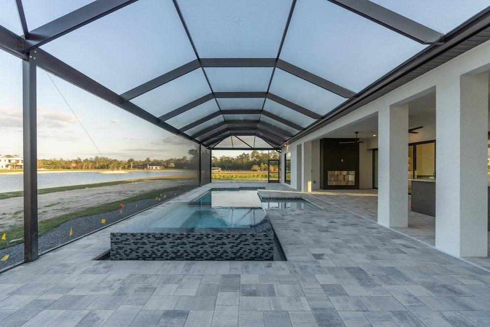 Barefoot ski Lake custom home. This beautiful home is located on a private ski lake community in Estero Florida. It has a very unique design with 2 oversized estate garages, 3 bedrooms, 3 baths, office, mud room plus utility room, 2600 sf living area with 1600 sf garage space, outdoor living featuring custom pool with spillover spa, fire place and outdoor kitchen, custom kitchen and baths, inside fireplace and many other features to list.