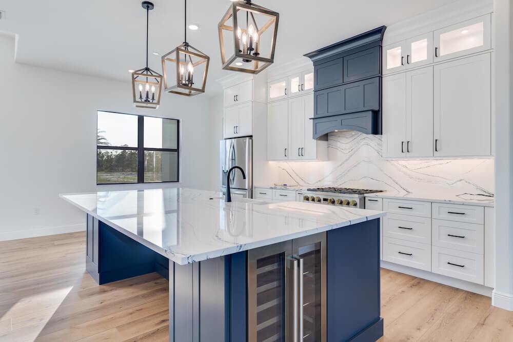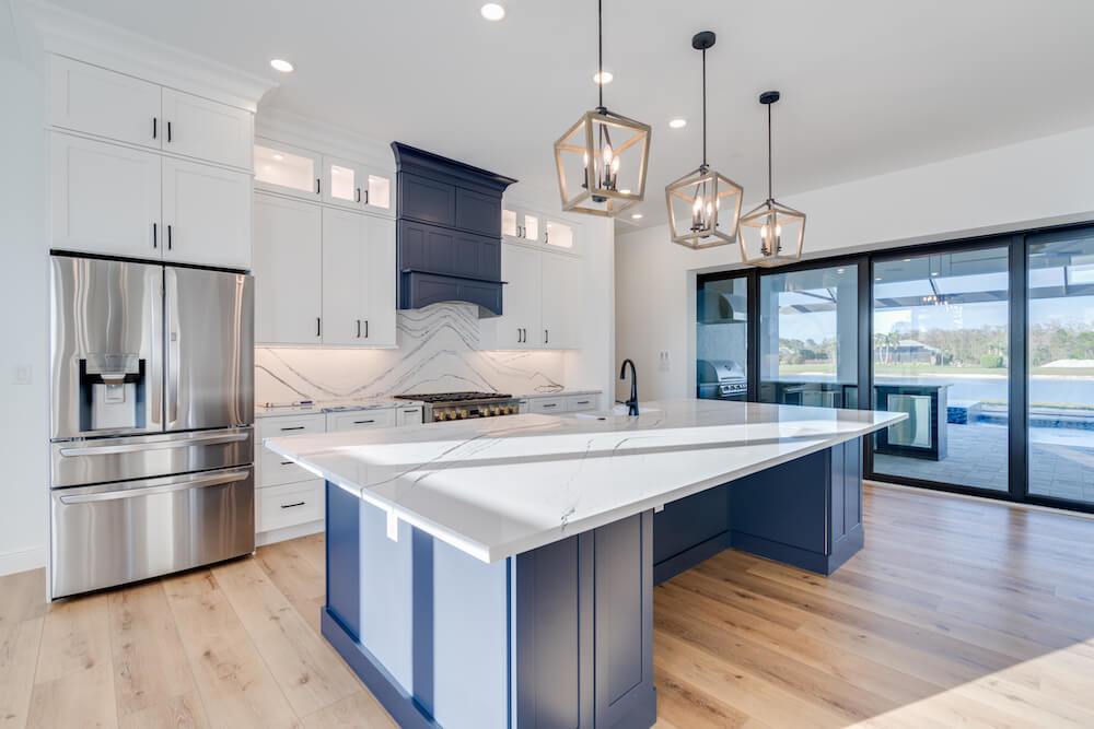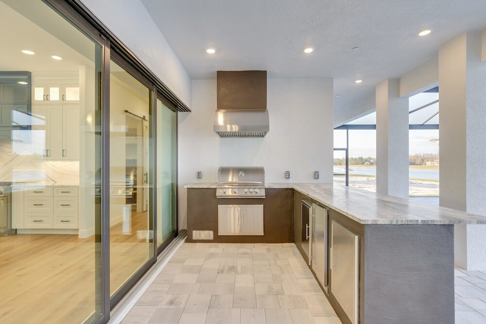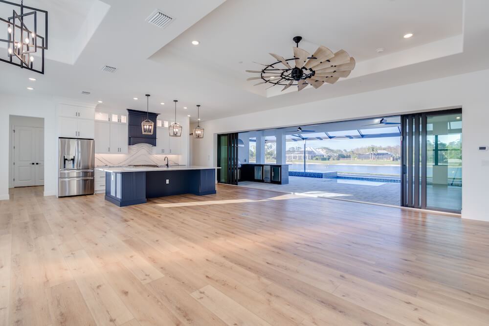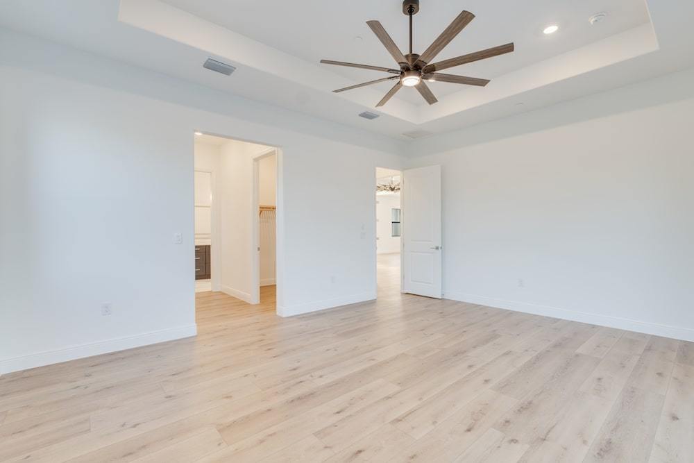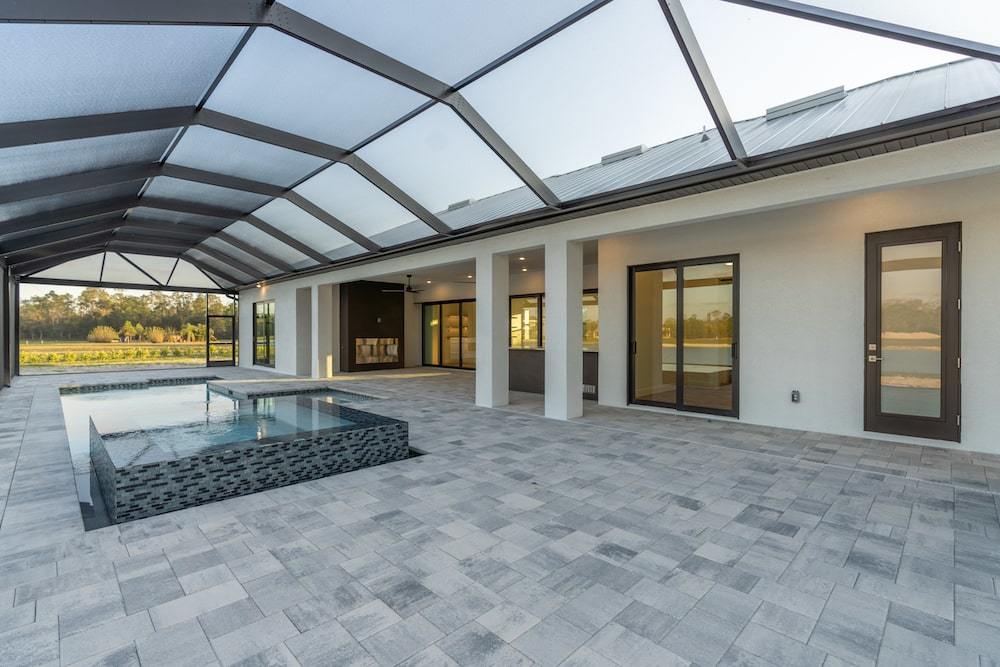 Barefoot ski Lake custom home. This beautiful home is located on a private ski lake community in Estero Florida. It has a very unique design with 2 oversized estate garages, 3 bedrooms, 3 baths, office, mud room plus utility room, 2600 sf living area with 1600 sf garage space, outdoor living featuring custom pool with spillover spa, fire place and outdoor kitchen, custom kitchen and baths, inside fireplace and many other features to list.