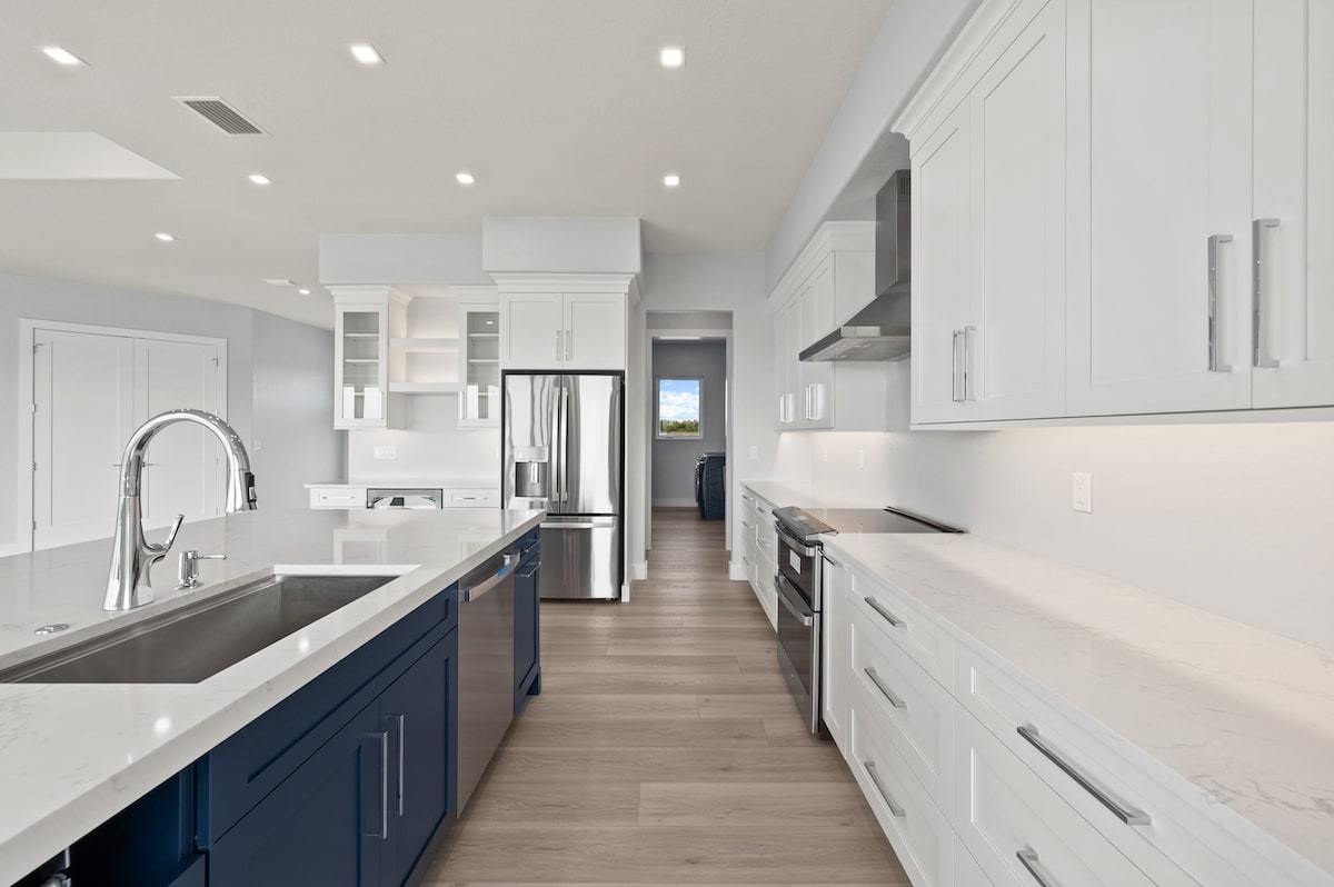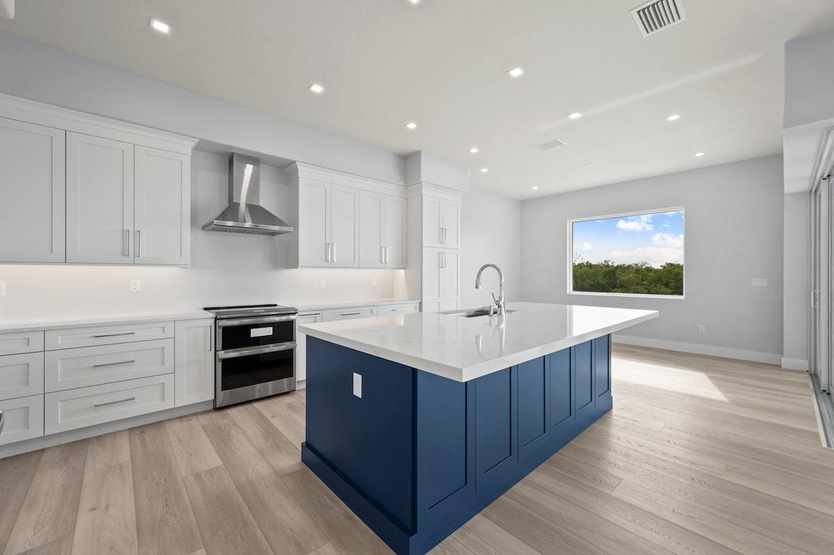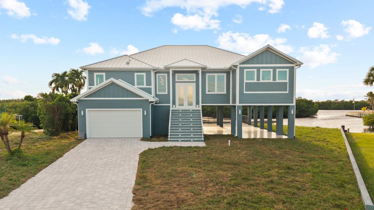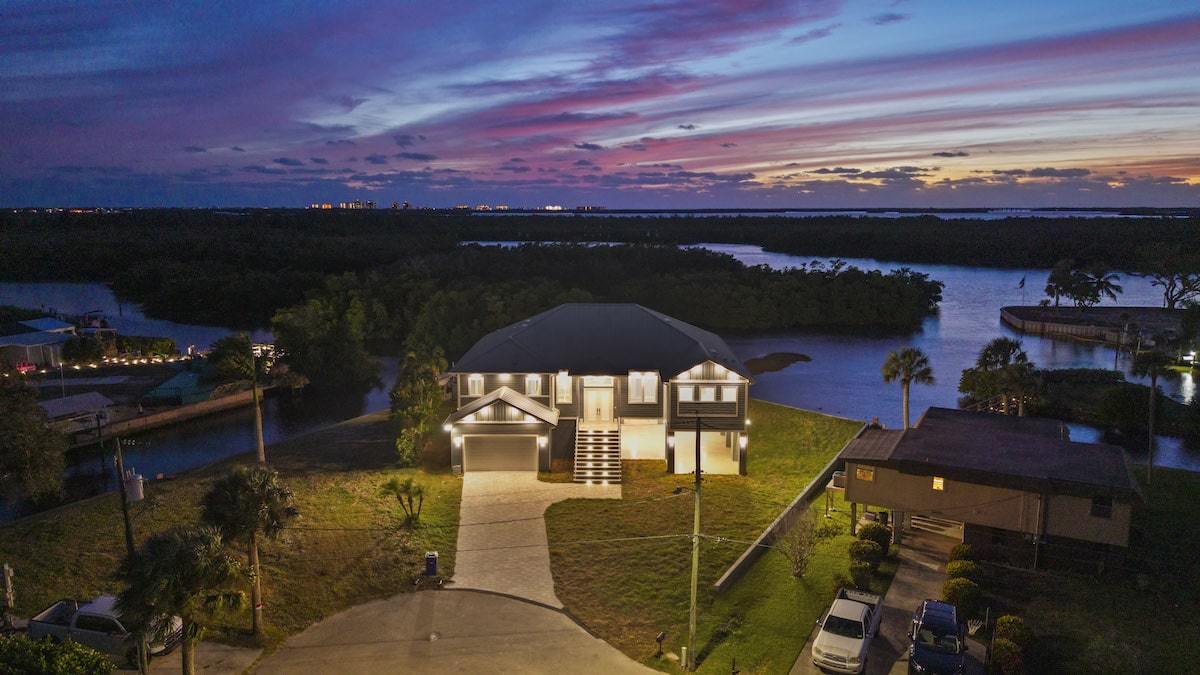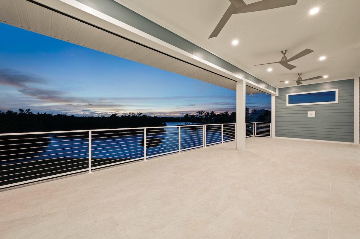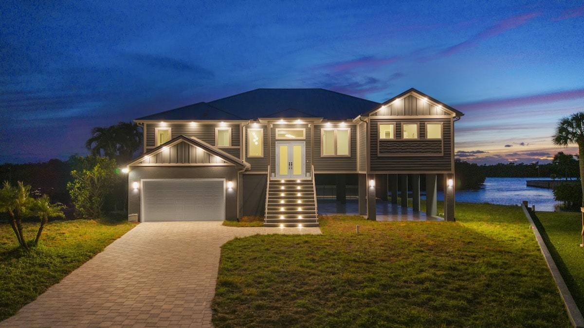 Our Dolphin St. project located in Estero, Florida is a custom Michaela plan elevated on piers and set on a piling and grade beam foundation. The plan is a 3 bedroom plus office Great Room style floor plan with 3 full baths. The lanai is extended and elevated with a view of the custom pool/spa below as well as the salt-water gulf access canal. The home is adorned from head to toe with many custom finishes selected to compliment the lifestyle of our wonderful owners. The custom cabinetry, counter tops, shower finishes as well as the flooring were all hand selected as part of our awesome color selection meetings! The pool is designed with an elevated spa with granite spillway. Every feature was hand selected through our design/build process and it shows in the beautiful finshed product.