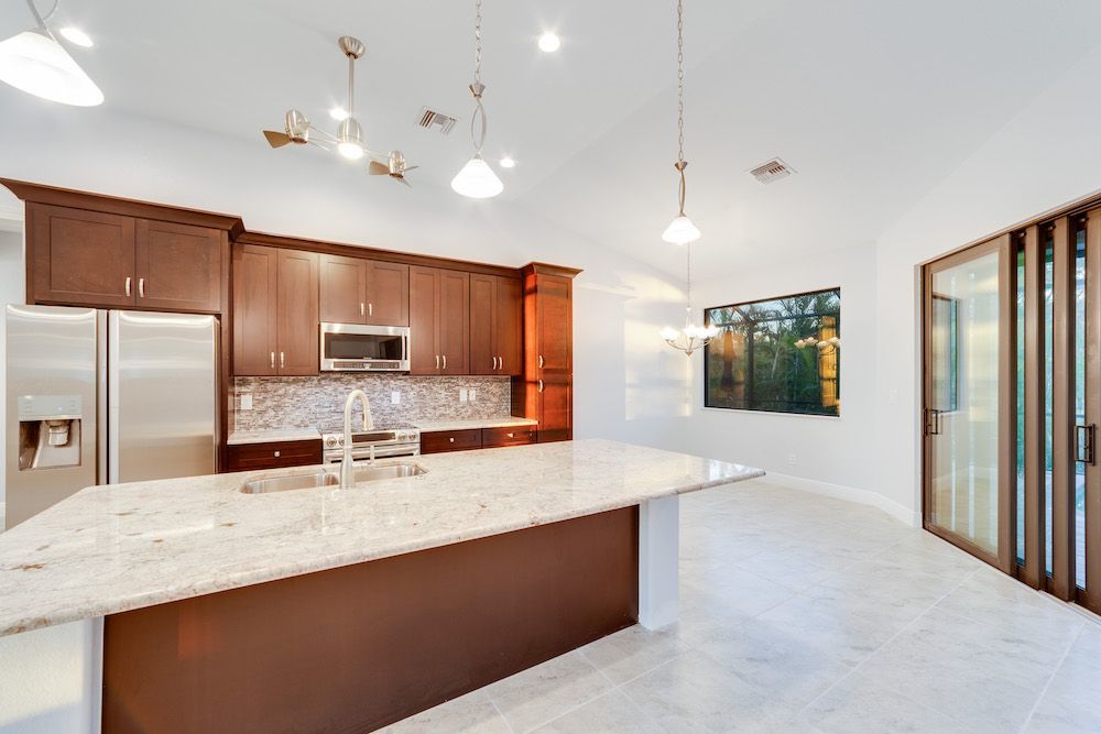 What a pleasure it was designing this home to fit on this lot. We used every square foot allowable within the set back requirements. We were able to provide enough ceiling height in the garage to allow for a custom car lift for extra parking. The home is an open concept design featuring 4 bedrooms and 2-1/2 baths with a beautiful pool and extended paver deck under cage. The Mediterranean accents blend nicely in the neighborhood and met all the community guidelines. The great room features an amazing view through the 135-degree sliding door configuration.