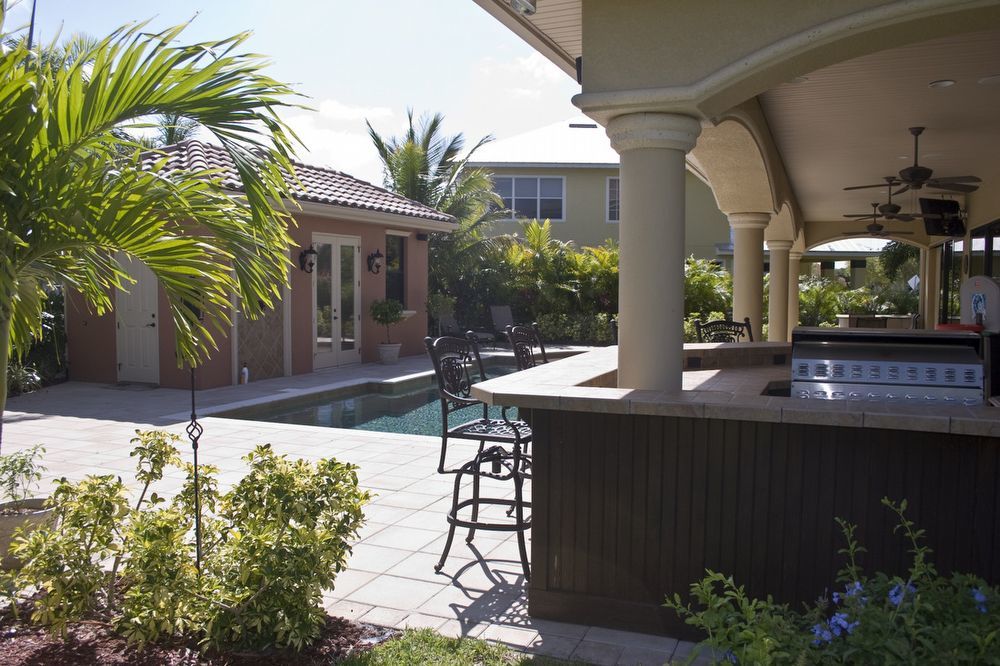 This gorgeous two-story home was a custom design by Harden Custom Homes. The back patio comes equipped with an outdoor grill, beautiful pool, and a pool house.