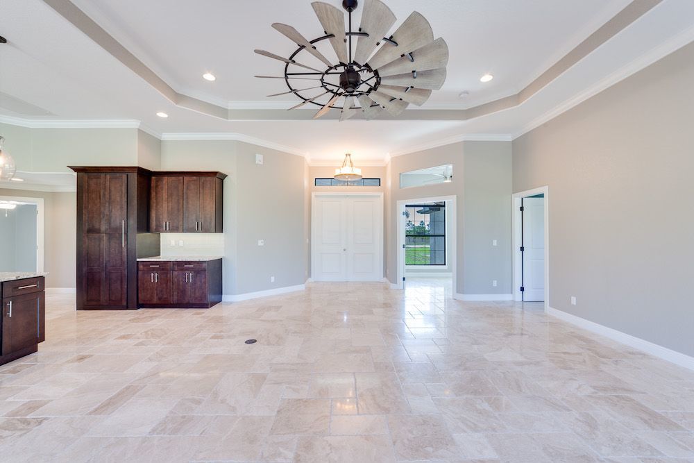 This spacious, Old Florida Style home has an estate series 3-car garage, spacious open floor plan featuring dark kitchen cabinets and sliding glass doors that lead from the living space to the lanai. This is a Michaela floor plan with a custom hidden pantry and chiseled edge travertine floors.