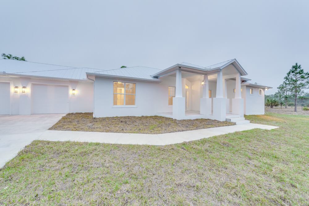 Notable features: Metal roof, Coretec Life-proof floors, impact glass, custom painted wood cabinetry, Quartz counter tops, 3-car oversized garage, custom kitchen design with built-in appliances, custom select shower wall tiles, prep for Outdoor Kitchen, old Florida style with taper columns up front