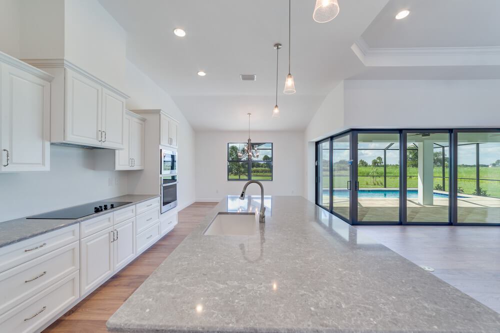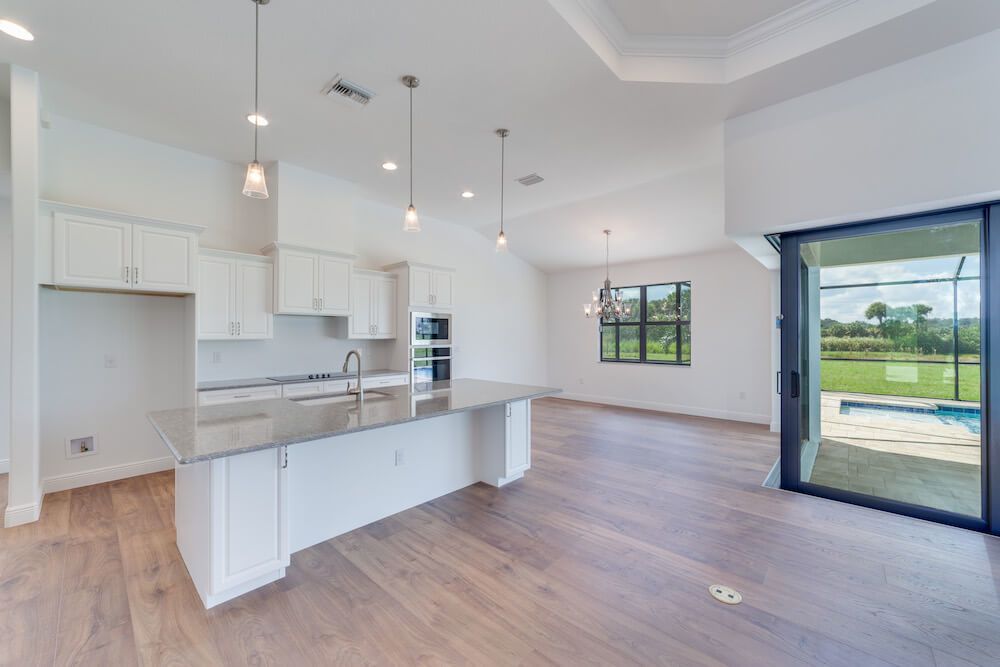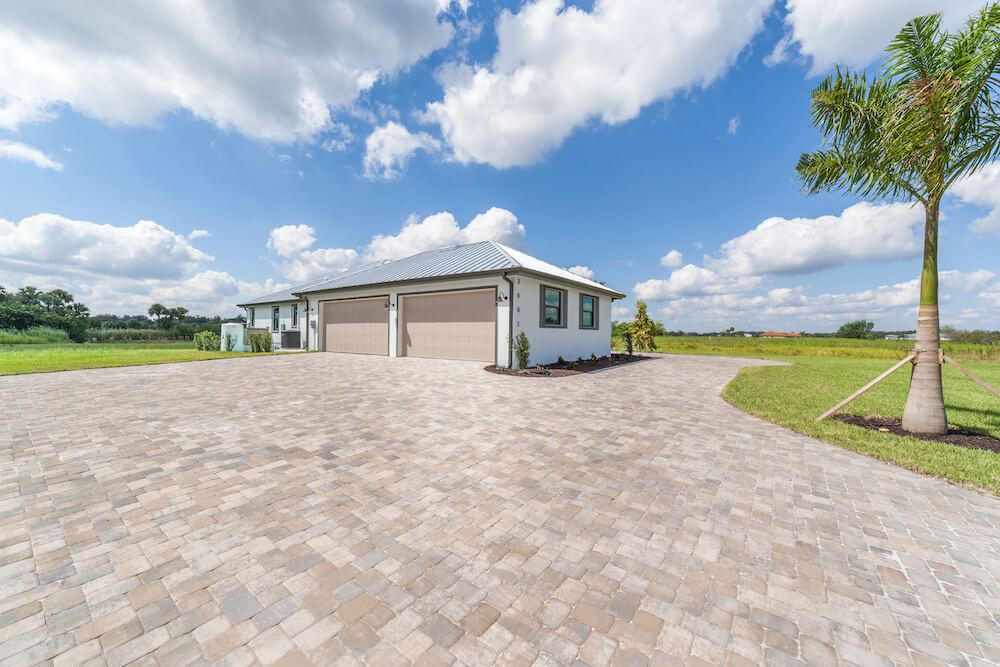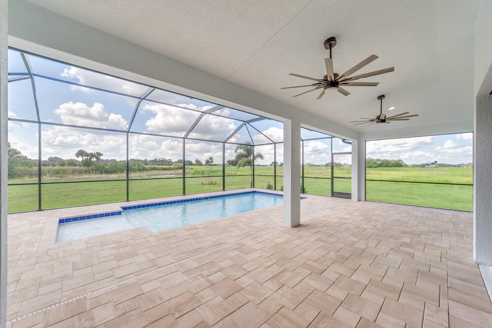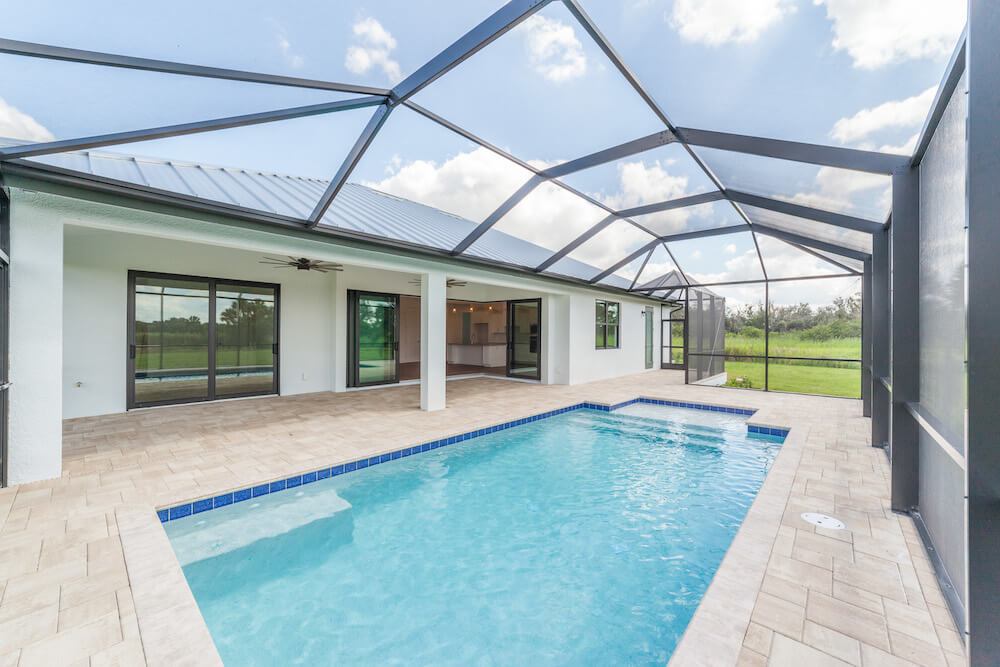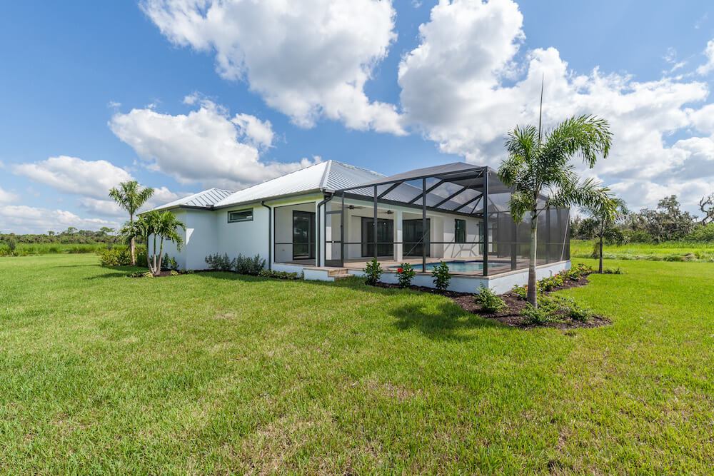 Notable features: 4 bedrooms, Study, Large utility, 3-1/2 baths, Walk-thru shower in master, Pool, Metal roof, Hurricane windows, 90 degree slider, Caloosa Bell elevation with front porch and tapered columns, Paver drive and walkway, Oversized garage, Upgraded 7” plank wood laminate flooring, Custom designed cabinetry with hand selected quartz tops