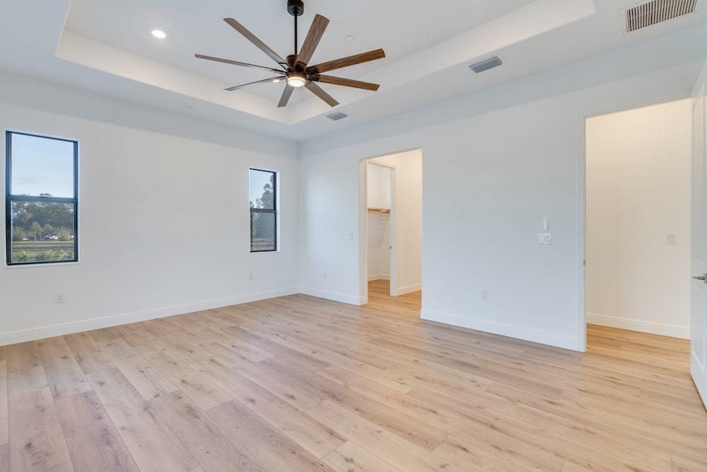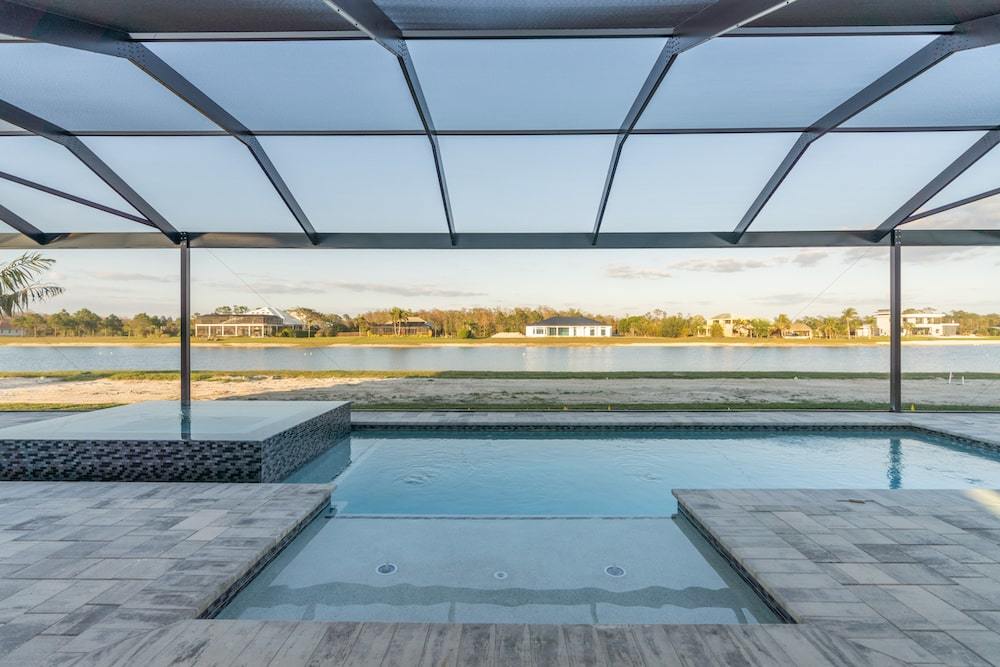 Barefoot ski Lake custom home. This beautiful home is located on a private ski lake community in Estero Florida. It has a very unique design with 2 oversized estate garages, 3 bedrooms, 3 baths, office, mud room plus utility room, 2600 sf living area with 1600 sf garage space, outdoor living featuring custom pool with spillover spa, fire place and outdoor kitchen, custom kitchen and baths, inside fireplace and many other features to list.