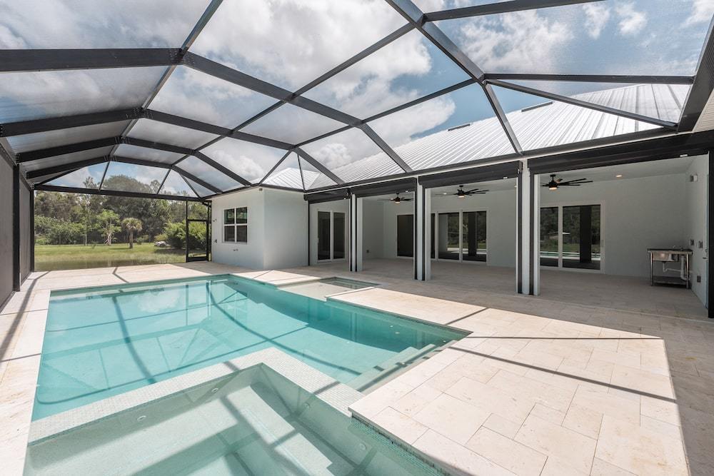Step outside to your private oasis: a stunning pool and spa with a sunken spa, all set on a beautiful Shell Lock paver deck, perfect for relaxing or entertaining year-round. For your peace of mind and long-term durability, the home features a sleek and resilient metal roof.